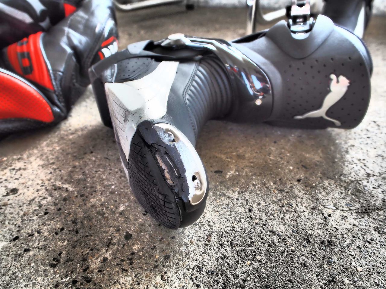 実は今まで履いていたブーツのアウトソールがめくれてしまったため、数年前に買い、ずっと履いていなかったプーマのライディングブーツを今回初めて履いたのです。そのおろしたてのブーツが最初の走行でこんなにしてしまって・・・